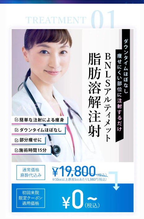 施術名:部分痩せ注射(BNLS アルティメット) 施術の説明:植物から抽出した成分を主成分とした脂肪溶解注射です。血流やリンパの流れを改善し、溶かした脂肪や体に溜まっている老廃物の排出を促す施術です。 施術の副作用(リスク):内出血・注入部分に発赤・腫れ・疼痛・つっぱり感・熱感・硬結を生じる可能性があります。 施術の価格:1本(原液1cc) 1,980円~3,030円 引用:湘南美容クリニック